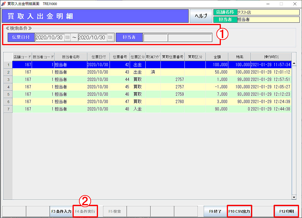 「買取入出金明細」で確認、明細の印刷・CSV出力が行えます。(下記「買取入出金明細」参照)