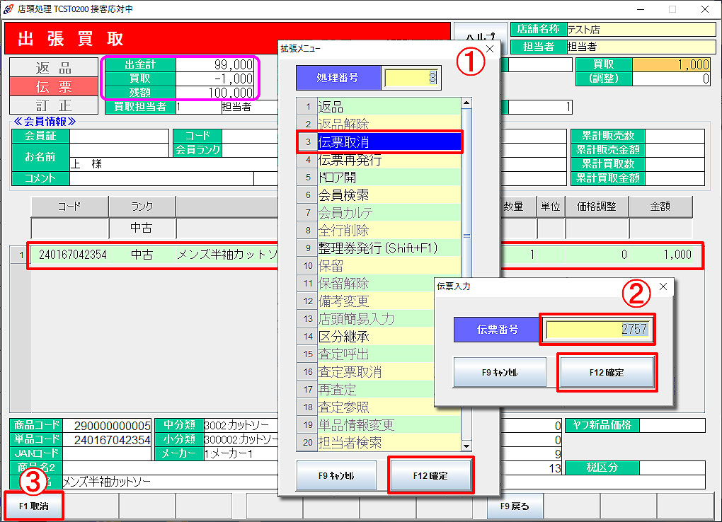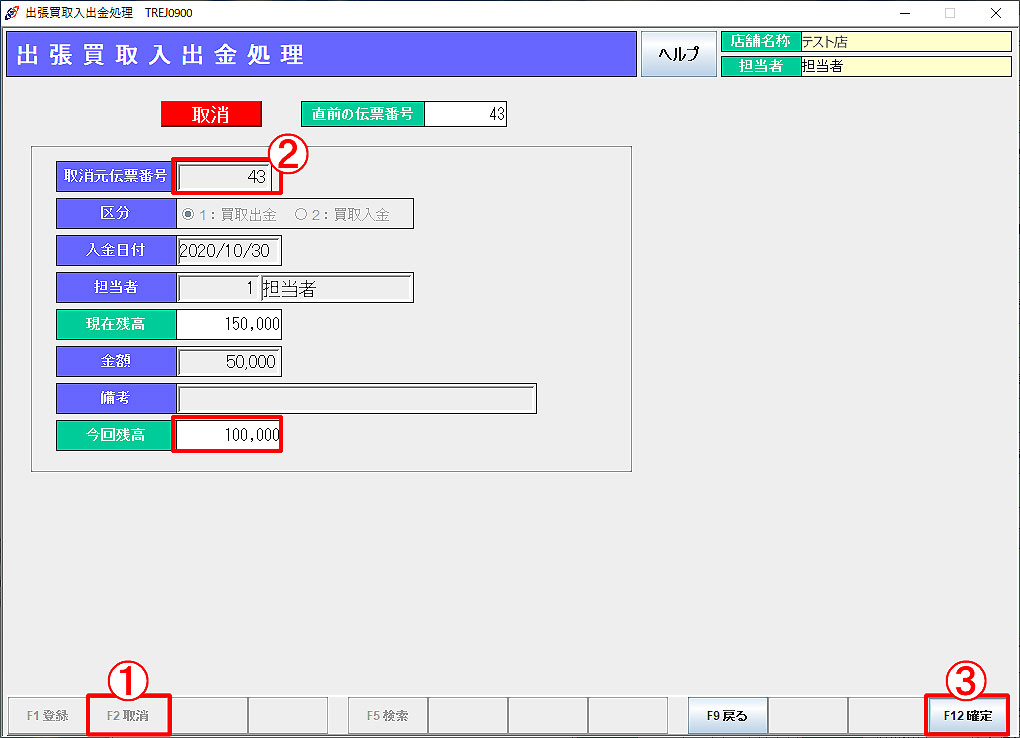 出張買取入出金取消 ① 出張買取入出金処理画面で「F2取消」をクリックします。