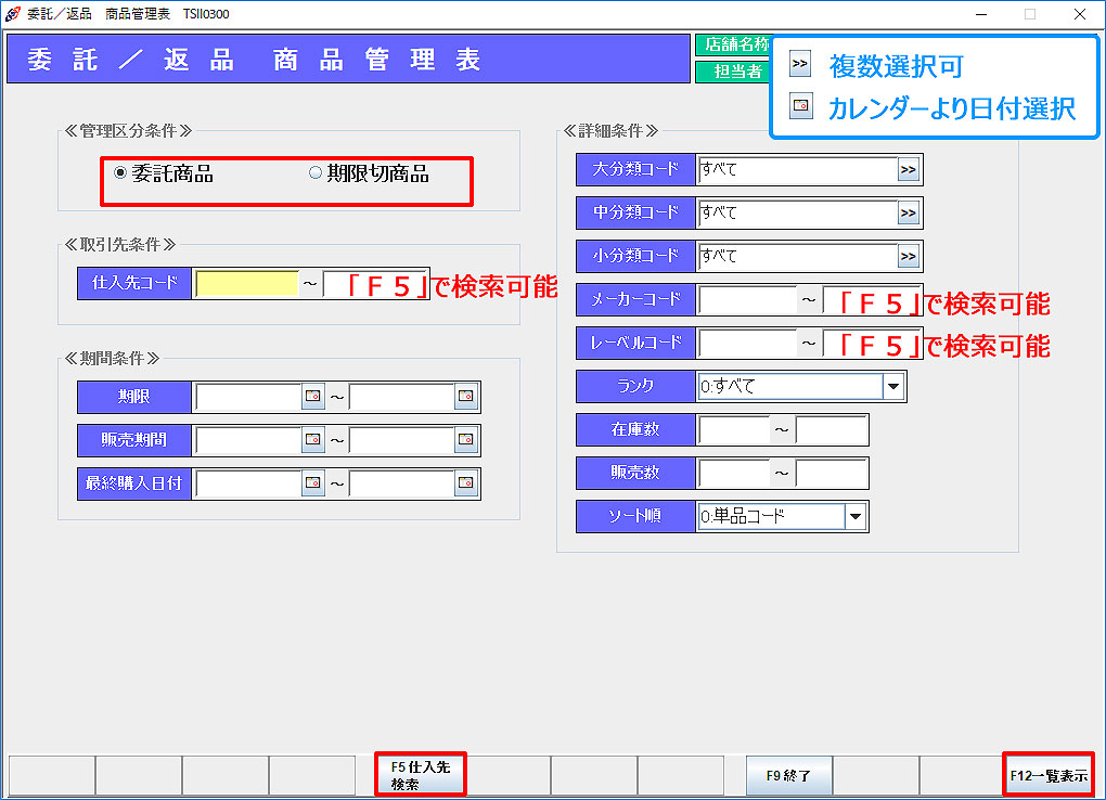 委託/返品商品条件 管理区分条件を「委託商品」または「期限切商品」より選択し、Enterキーを押します。