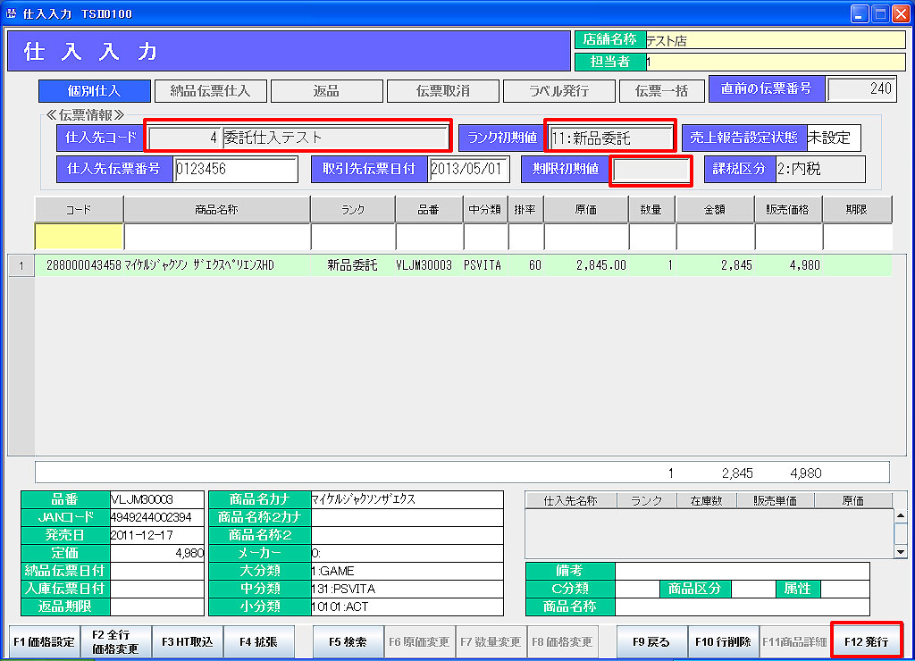 ③ 「F12発行」で仕入処理を確定します。