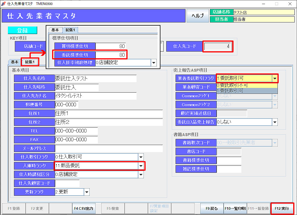 委託取引業者コードを入力し、ランク初期値には「新品委託」を選択します。