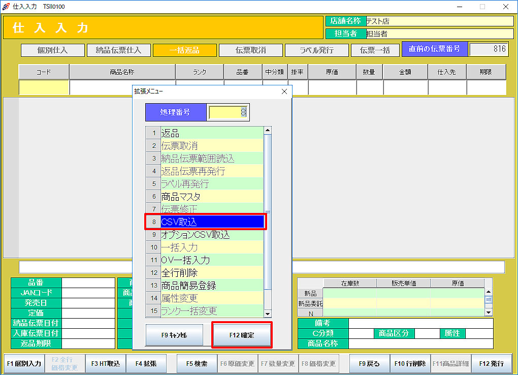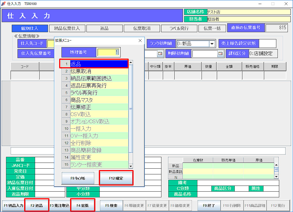 仕入入力画面で「F4拡張」より拡張メニューを開きます。
