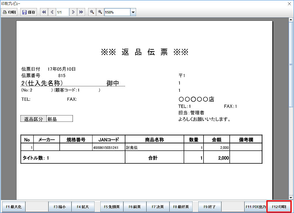 ⑤ 「返品伝票を印刷しますか?」と表示されます。