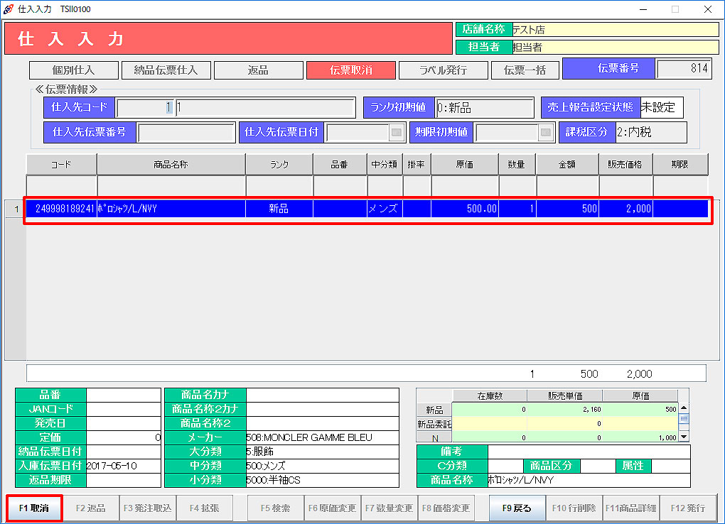 取消したい伝票の番号を入力し、「F12確定」をクリックします。