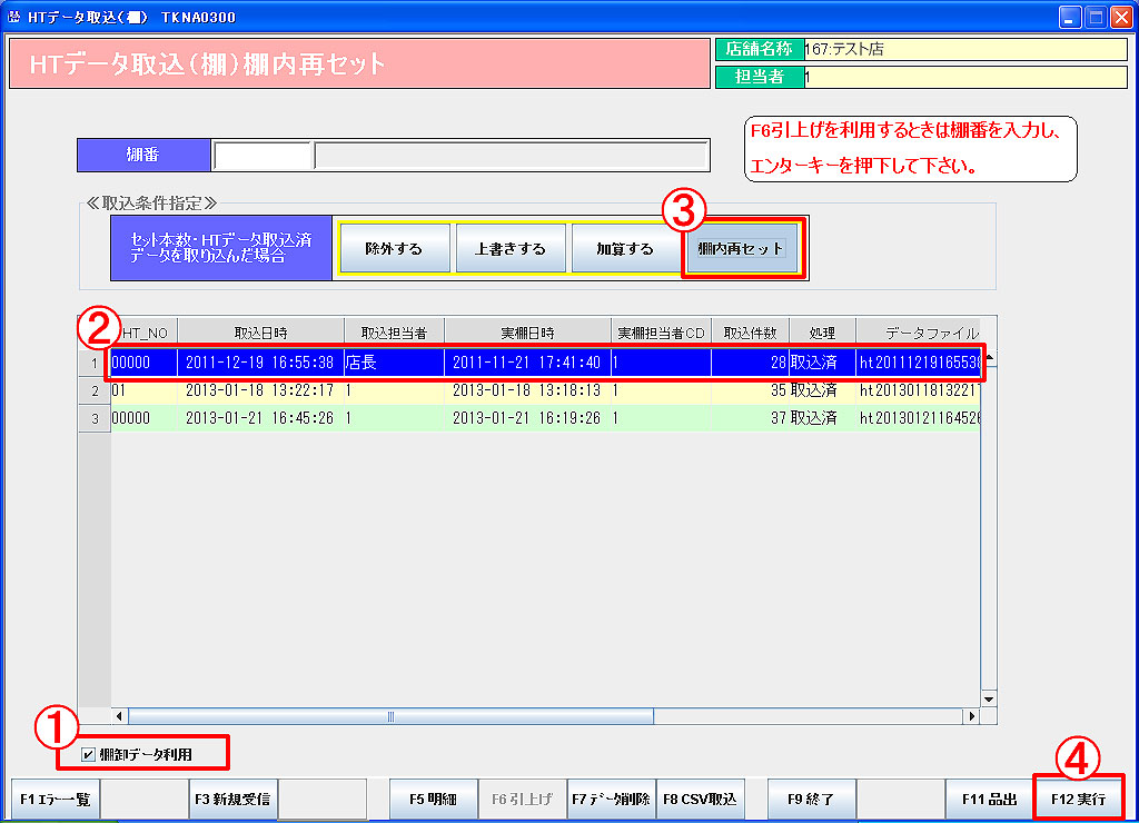 ⑤ 「F12実行」をクリックすると、取込んだデータが棚にセットされます。