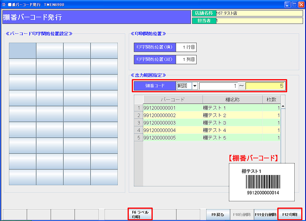 2.「棚番バーコード発行」で棚番バーコードラベルを発行します