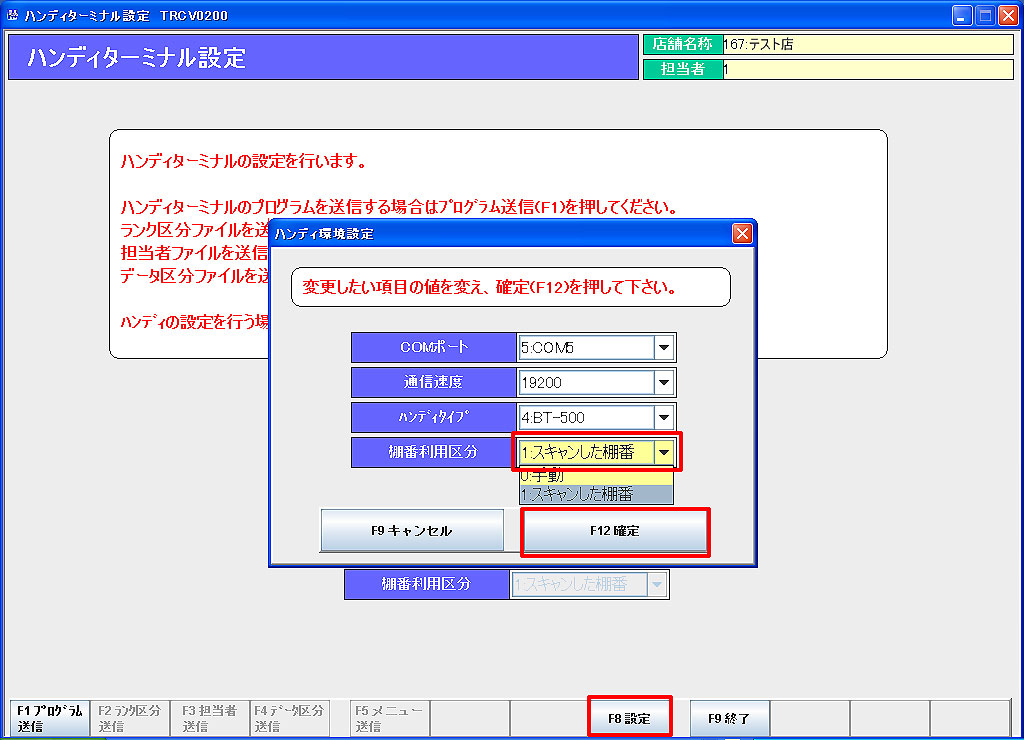 3.ハンディターミナル設定の棚番利用区分を「スキャンした棚番」に設定します