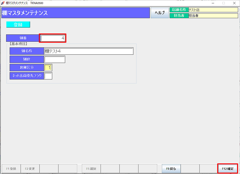 - 倉庫区分:倉庫区分に「1」を入力すると、棚が倉庫に設定され、品出機能が有効になります。