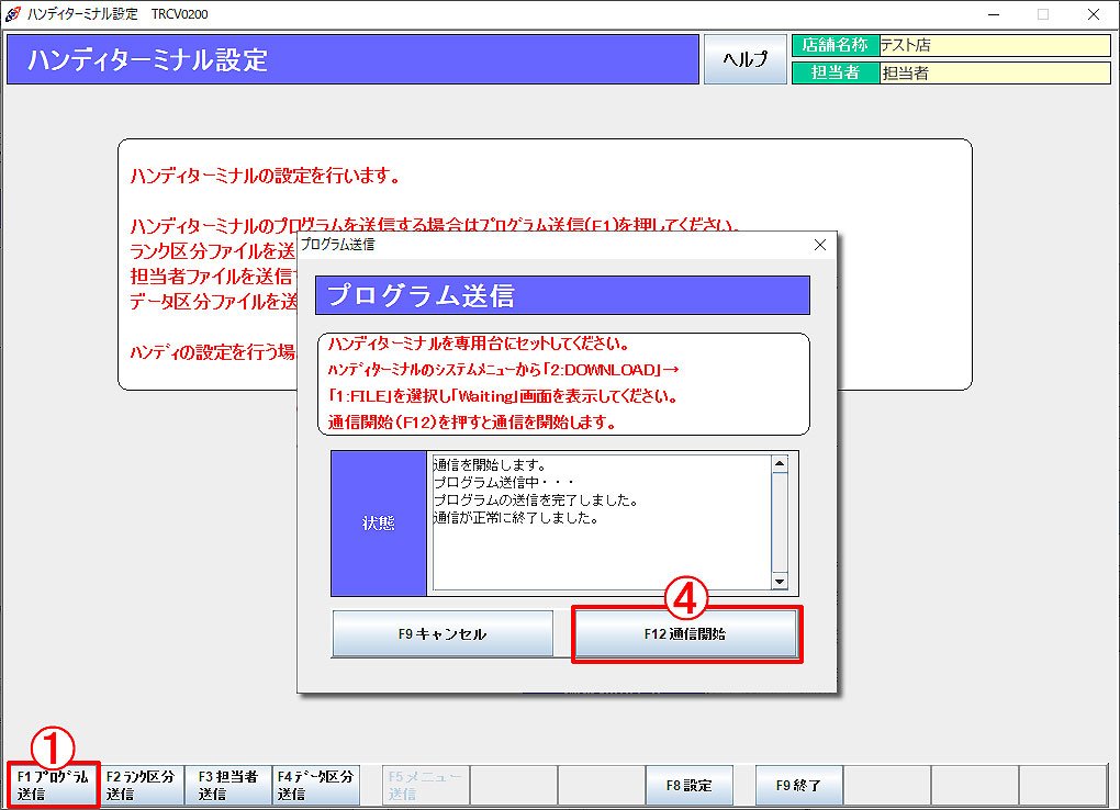 ① ハンディターミナル設定画面で「F1プログラム送信」をクリックします。 【プログラム送信】画面が表示されます。