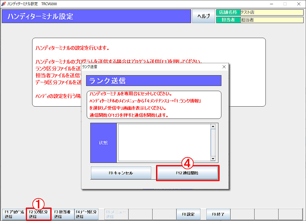 ① ハンディターミナル設定画面で「F2ランク区分送信」をクリックします。 【ランク送信】画面が表示されます。