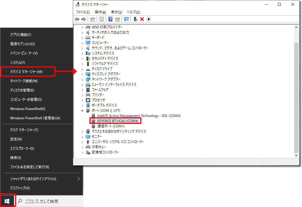 ※ COMポート番号を確認する方法は、お使いのOSにより異なります。ここではWindows10を例にご説明します。