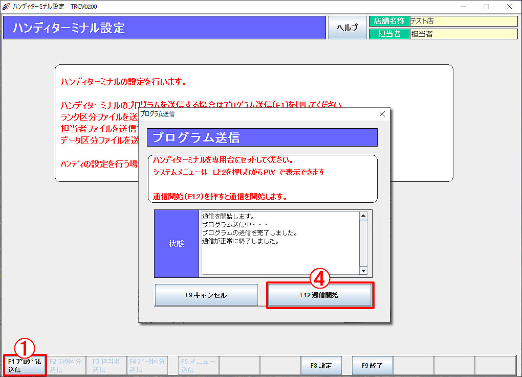 ① ハンディターミナル設定画面で「F1プログラム送信」をクリックします。 【プログラム送信】画面が表示されます。