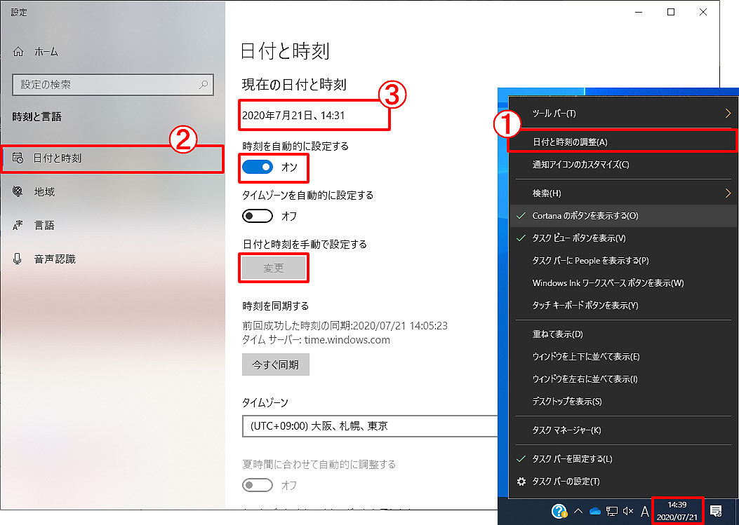 ※ Windowsの日付や時刻を変更する方法は、お使いのOSにより異なります。ここではWindows10を例にご説明します。