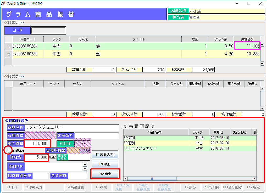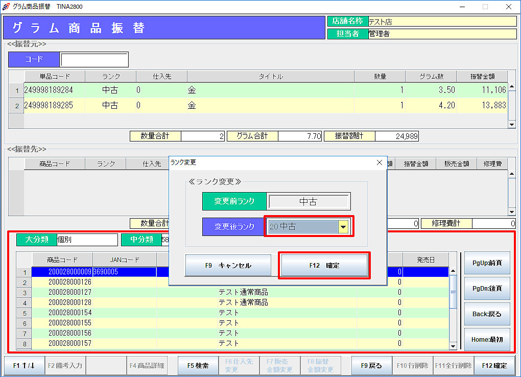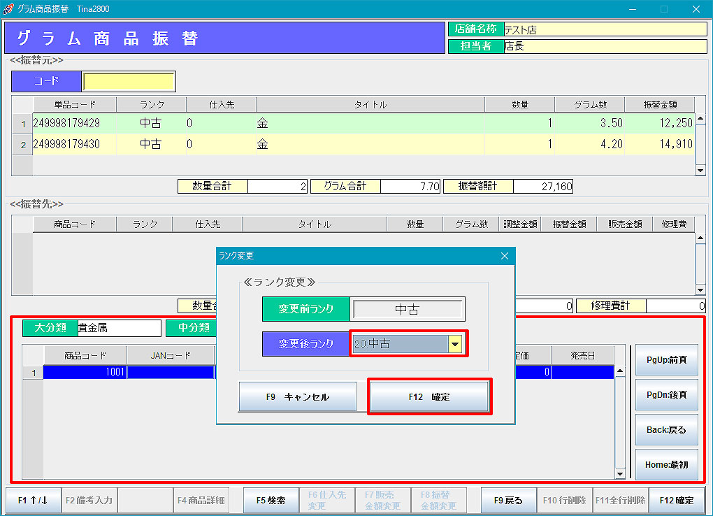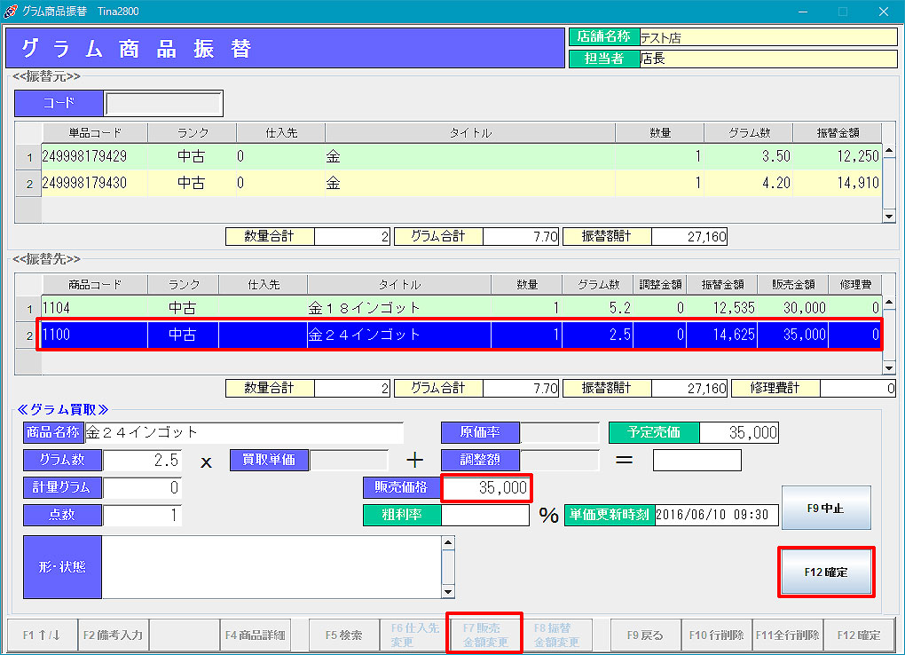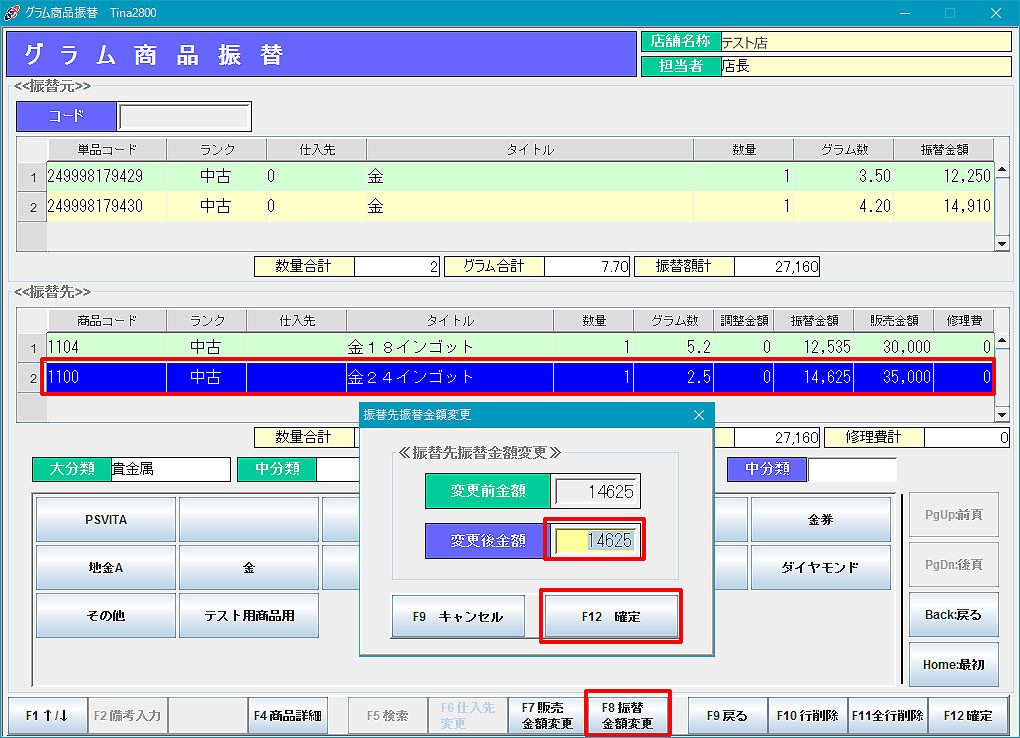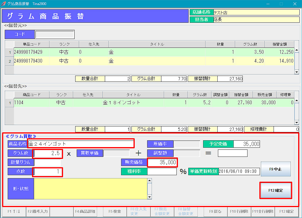 グラム商品振替 4.「F12確定」で処理を実行します。