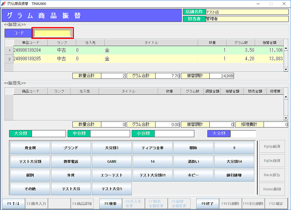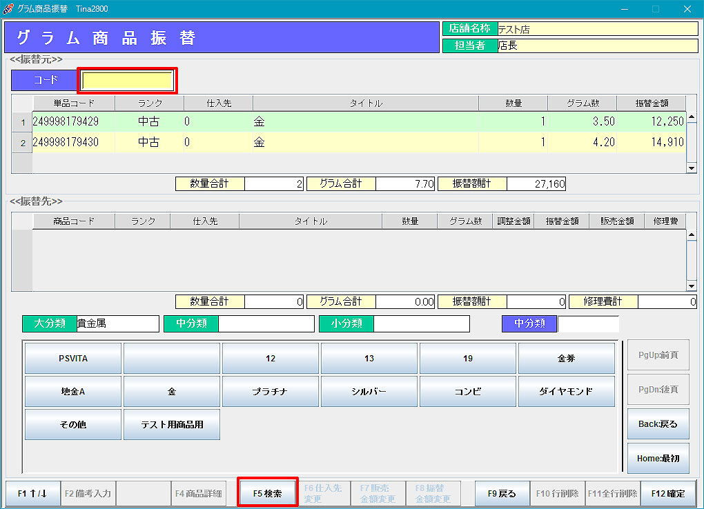 グラム商品振替 2.分類選択、もしくは商品検索(F5)で振替先の商品を