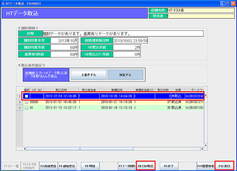 HTデータ取込画面で「F8CSV取込」より、保存した棚卸取込CSVファイルを選択して取り込みます。