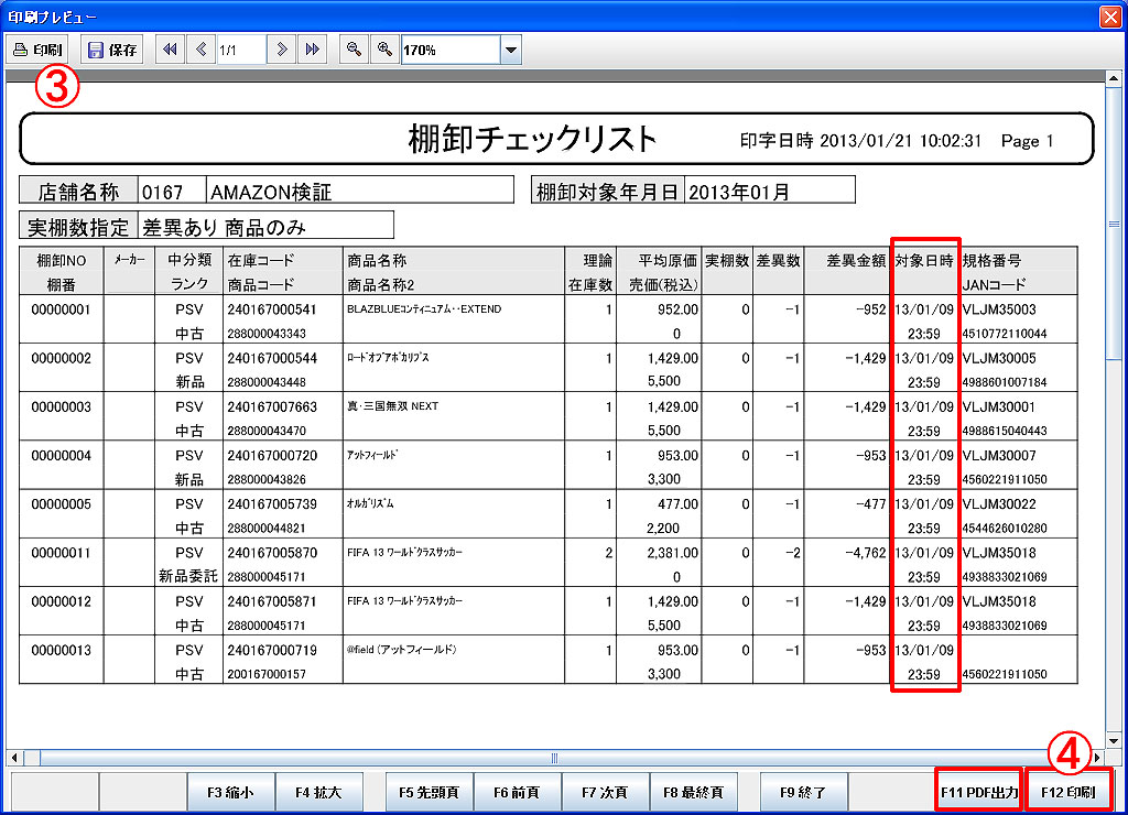 棚卸チェックリストはPDFファイルで保存(③-「F11PDF出力」)することもできます。