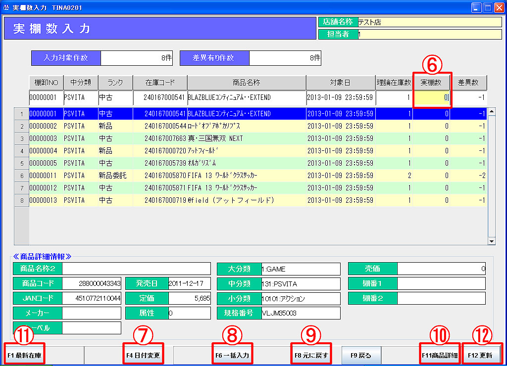 「F6一括入力(⑧)」:選択行から下の実棚数を一括で入力