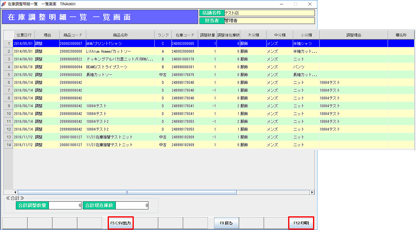 「F12印刷」:在庫調整明細一覧を印刷します。