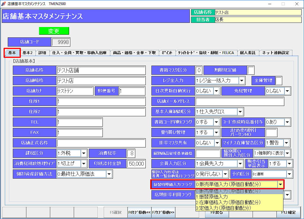 在庫振替は、振替時に原価を自動配分する方法と、自動配分は行わず振替先商品ごとに振替金額を手入力する方法があります。 初期設定は原価を自動配分する設定になっています。また、振替元の原価を振替先でどう配分するかも 「店舗基本マスタ(基本)」の振替時原価入力フラグで設定できます。