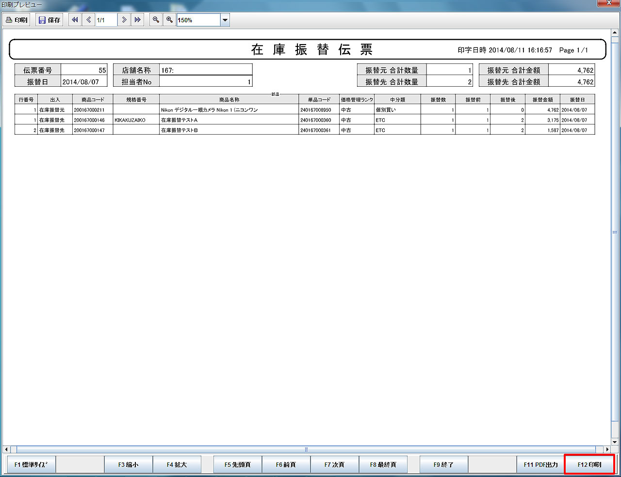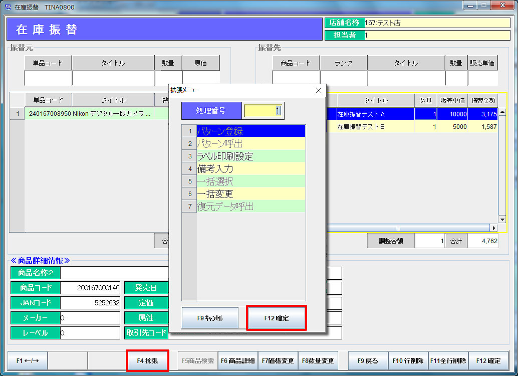⑤ 「F12確定」でデータを更新し、ラベル発行・在庫振替伝票印刷を行います。