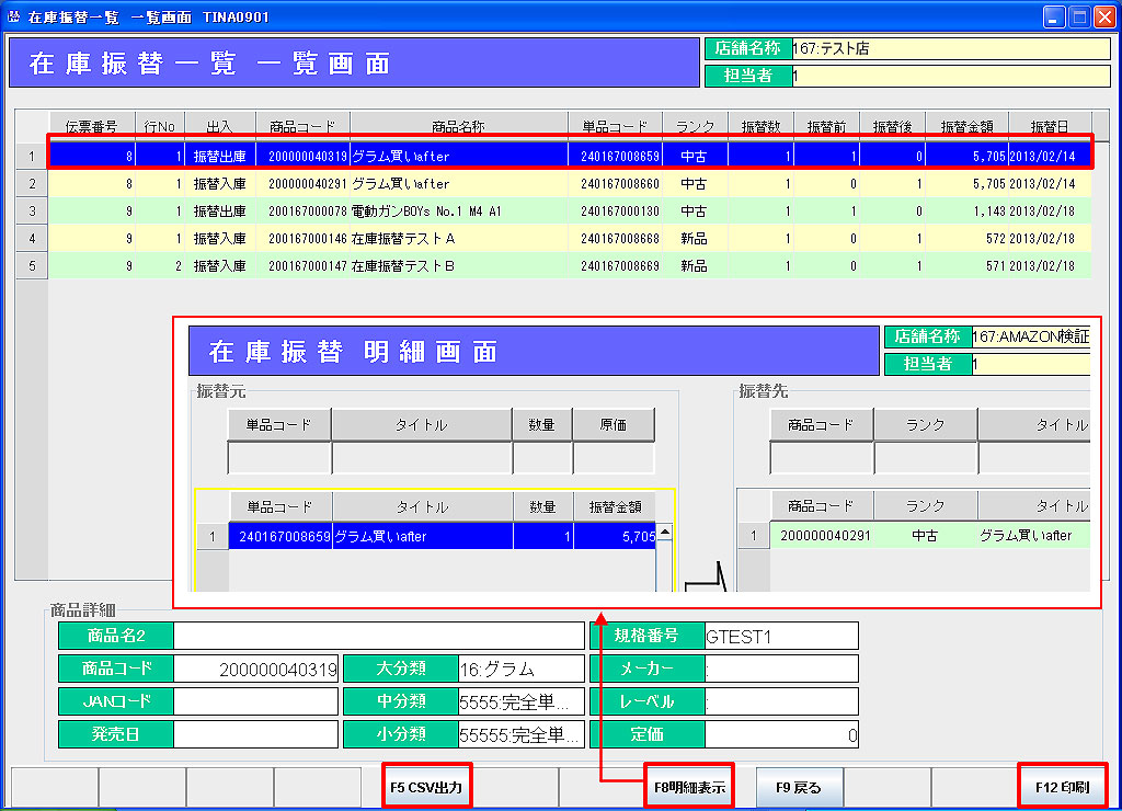 「F8明細表示」:選択行の在庫振替明細を表示します。