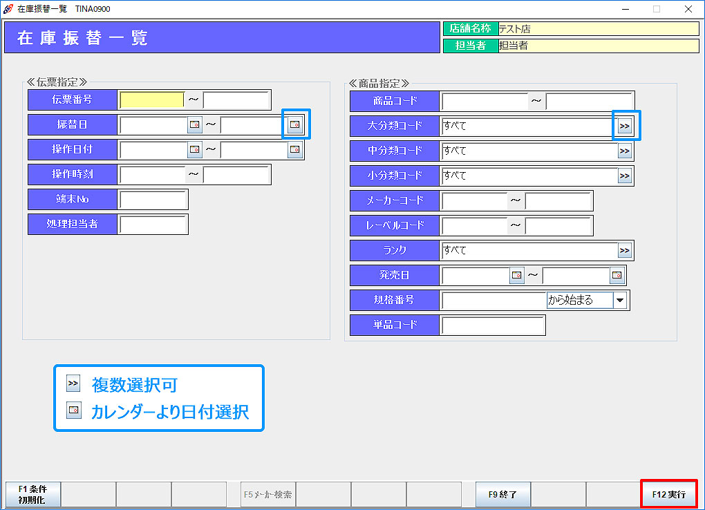 ② 「F12実行」で入力した条件に当てはまる在庫振替一覧が