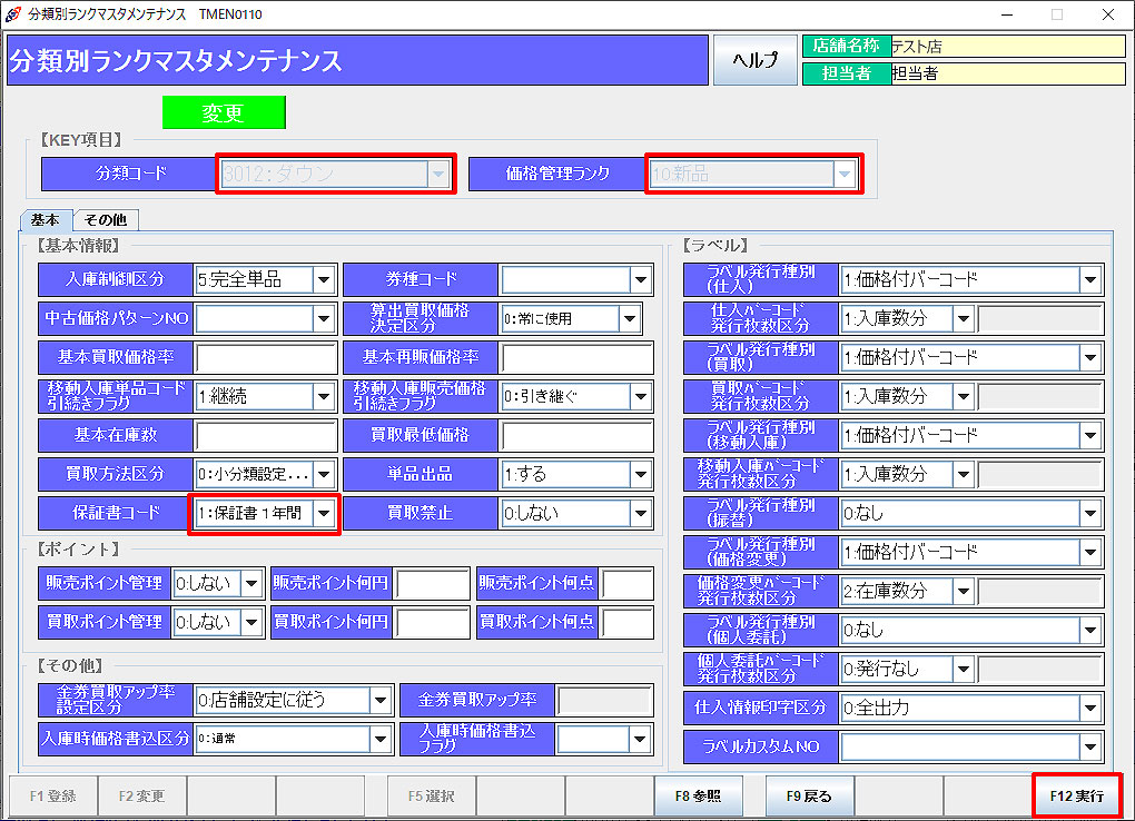 3.分類別ランクマスタで中分類ごとに発行したい保証書を設定します。
