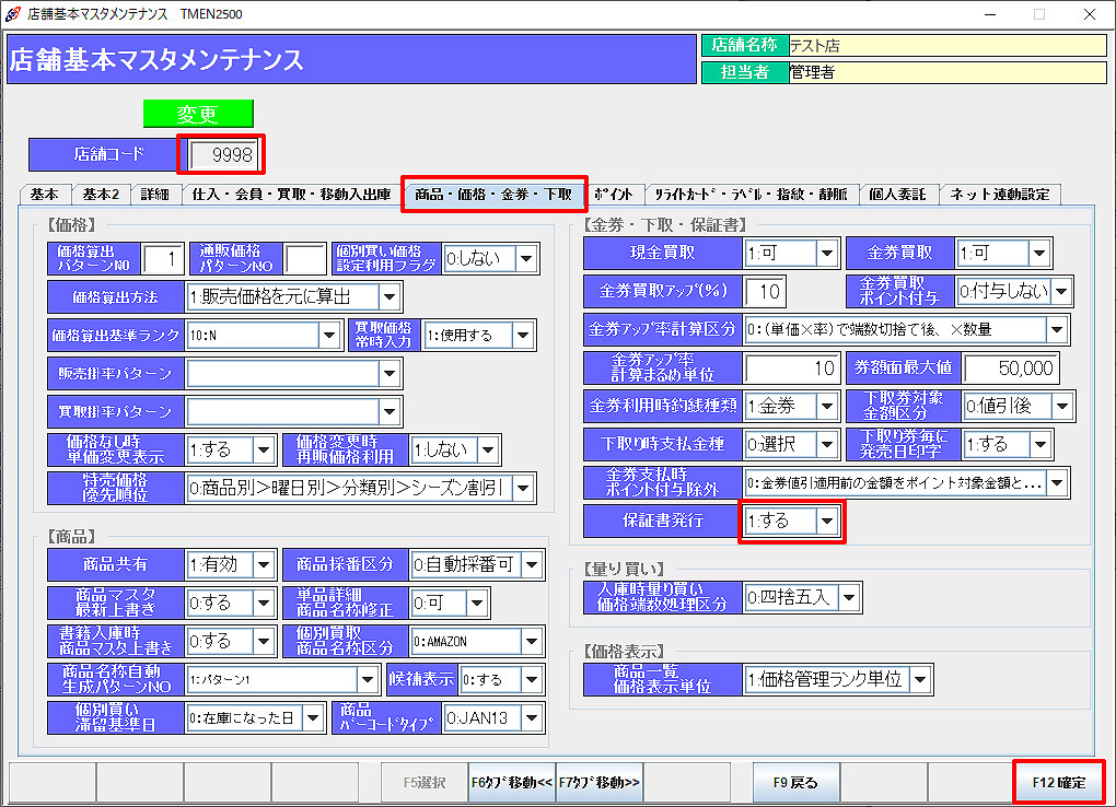 1.店舗基本マスタメンテナンスで保証書の発行を有効にします。