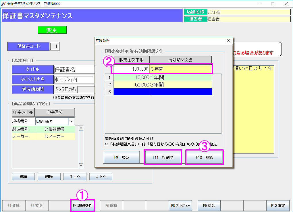 保証書には「(②券有効期間もしくはF4詳細条件設定による)保証期間」「(③の設定による)商品情報」「(④の設定による)注意事項」が印字されます。