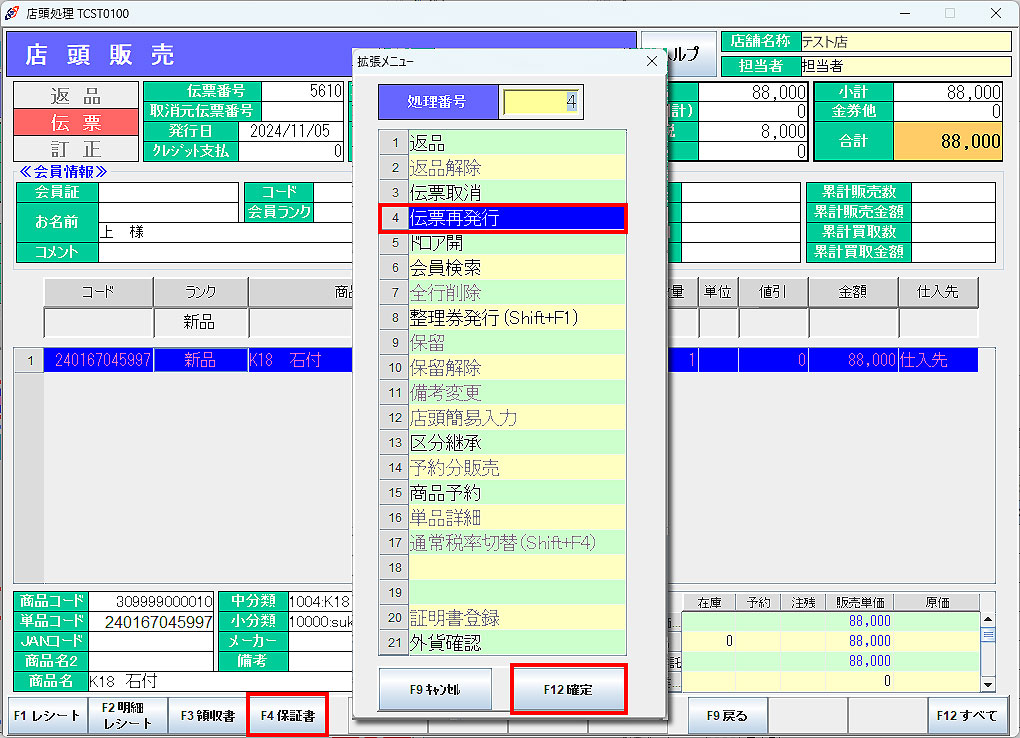 ④ 伝票明細をご確認の上「F4保証書」をクリックします。