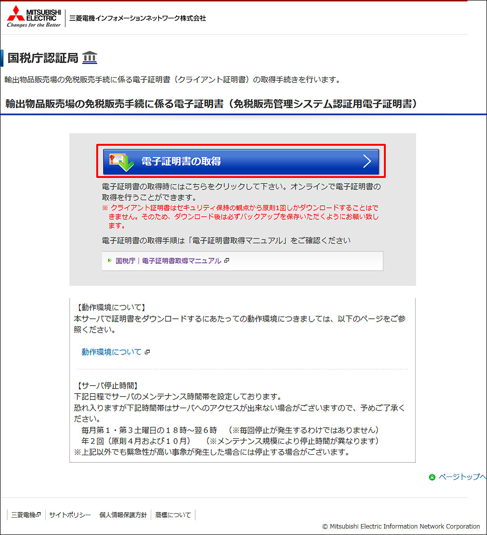 「国税庁認証局」サイトへアクセスし、クライアント証明書のダウンロードを行います。