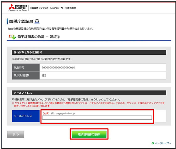 発行対象となる識別符号を確認してメールアドレス欄へ所轄税務署に届け出たメールアドレスを入力後、 「電子証明書の取得」ボタンをクリックします。