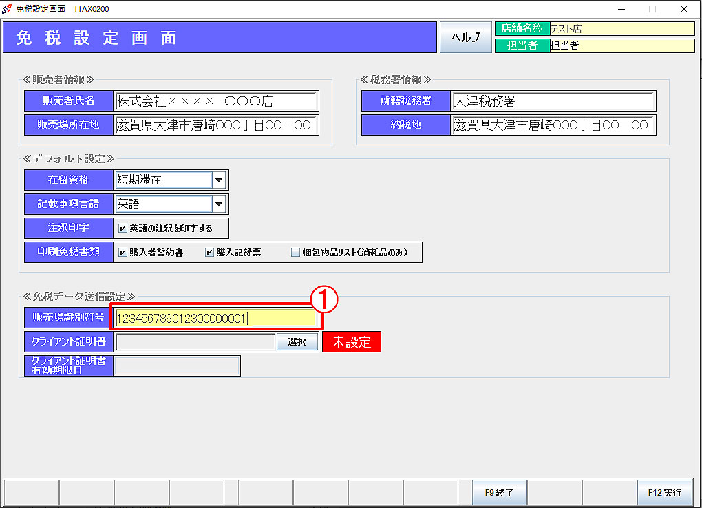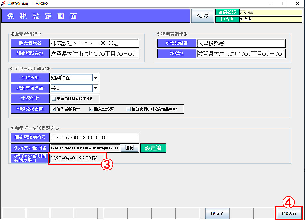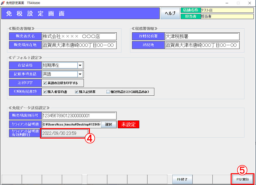 ⑤ 「F12実行」をクリックし、免税設定を保存します。