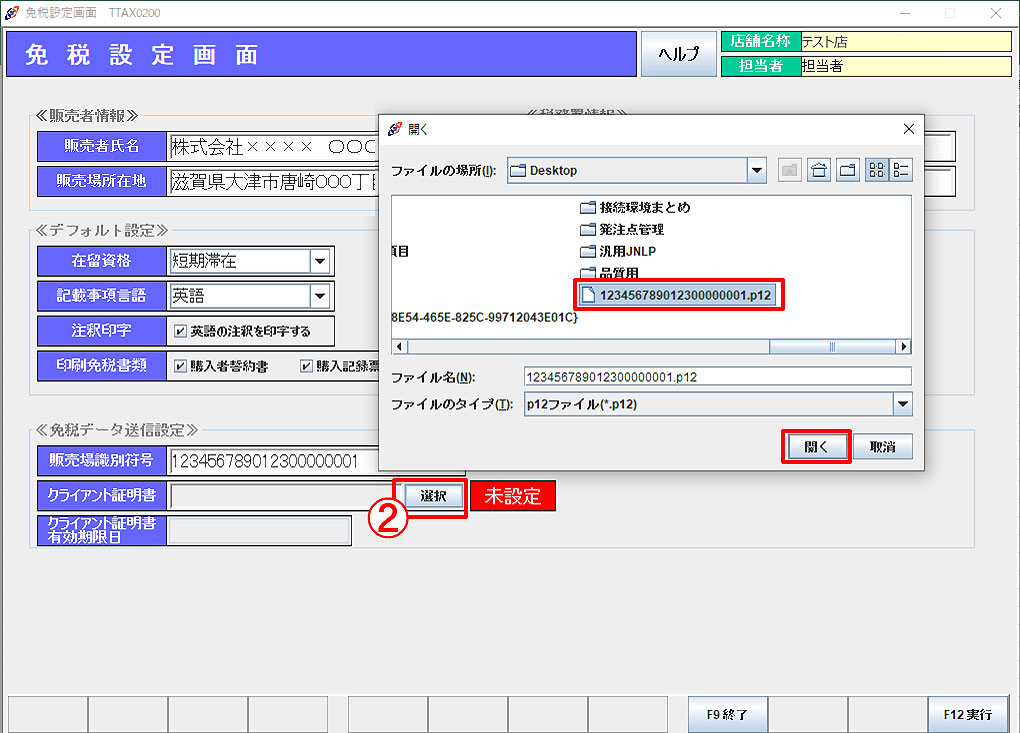 ② クライアント証明書の「選択」をクリックし、「******.p12ファイル」を選択します。