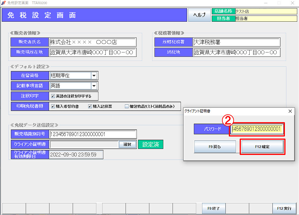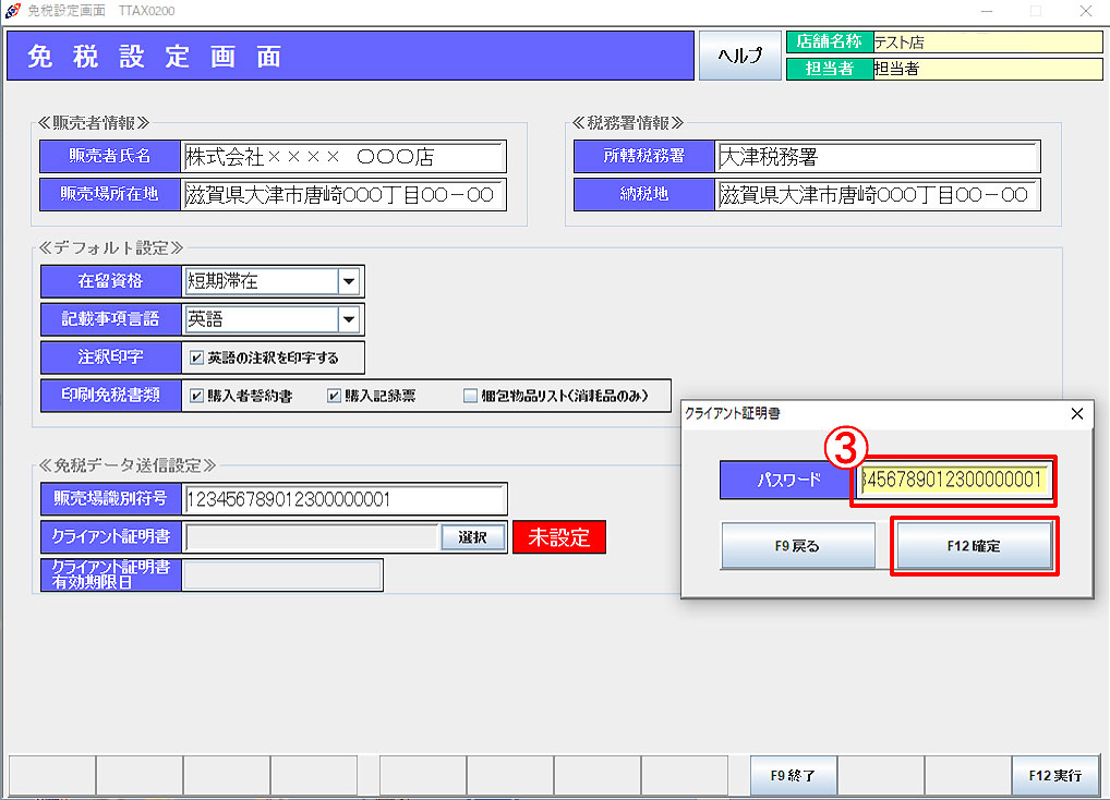 ② 【クライアント証明書パスワード入力】画面が表示されます。 パスワードに「販売場識別符号の値」を入力し、「F12確定」クリックします。