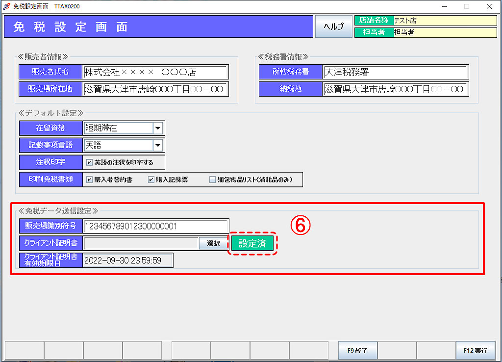 ⑥ 再度「免税設定画面」を開き、クライアント証明書が「設定済」になっていることを確認します。
