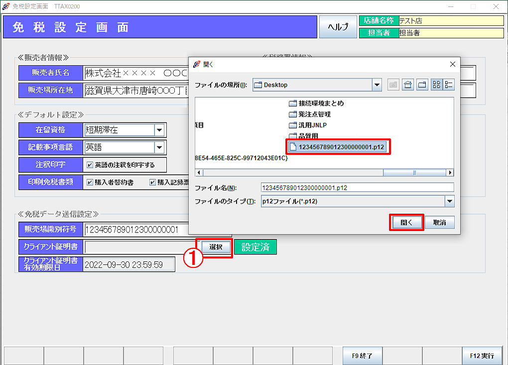 クライアント証明書の「選択」をクリックし、「******.p12ファイル」を選択します。