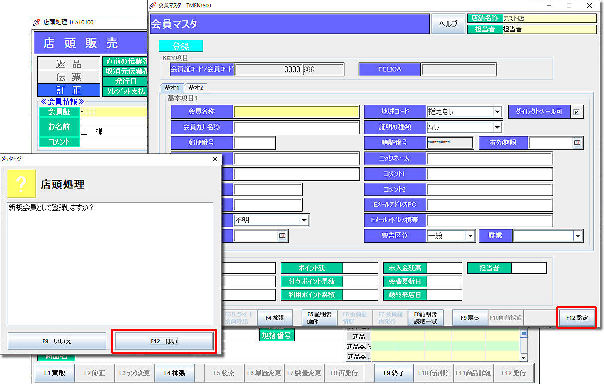 「F12はい」をクリックすると、【会員マスタ登録】画面が表示されますので、基本項目を入力して登録します。