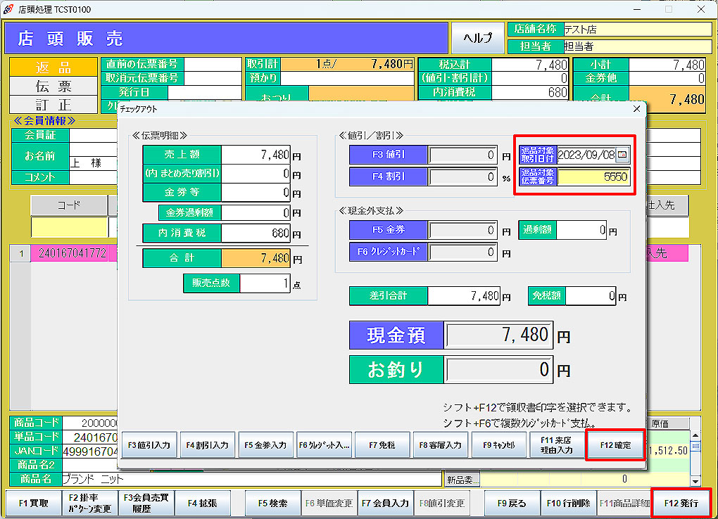 店頭販売画面店舗基本マスタ(基本2)>インボイス利用フラグ」が「1:利用する」に設定されている場合は、 販売返品チェックアウト画面に「返品対象取引日付」と「返品対象伝票番号」入力欄が表示されます。 販売時の伝票番号と伝票日付を入力し「F12確定」をクリックします。