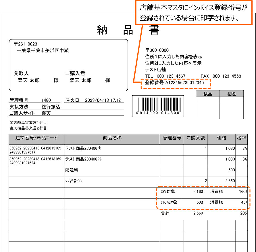 店舗基本マスタ(基本2)>インボイス利用フラグ」が「1:利用する」の場合に、WEB販売納品書に「インボイス登録番号」が印字されます。