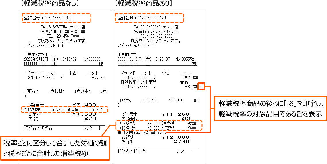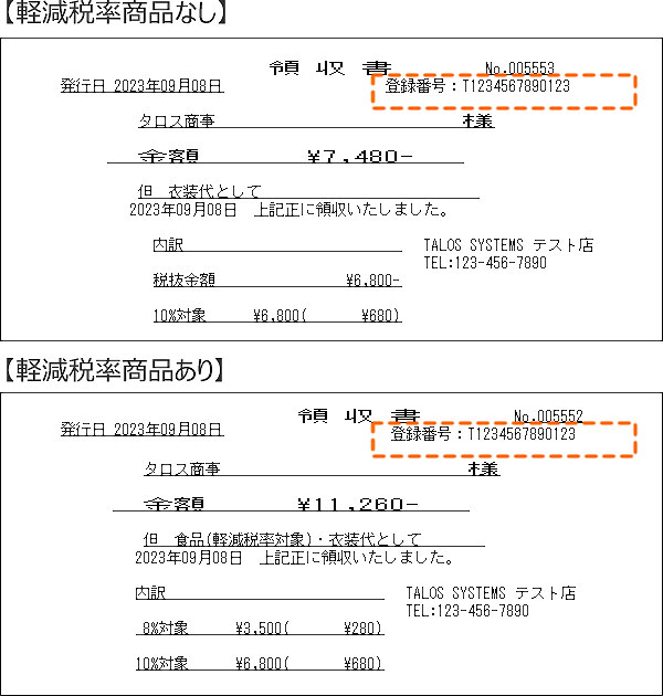 販売レシート・販売明細レシート(パターン1のみ)・領収書に「インボイス登録番号」が印字されます。