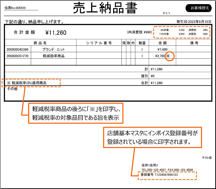 業者販売納品書 ※ インボイス用書類であるため、税率ごとに合計した対価の額(税抜き又は税込み)および適用税率と税率ごとに合計した消費税額が印字されます。 「店舗基本マスタ(基本2)>軽減税率利用フラグ」が「利用しない」の場合でも税内訳を印字します。