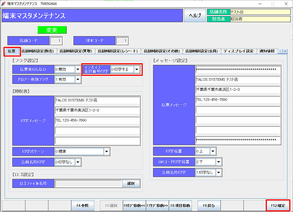 店舗基本マスタ店舗基本マスタ(基本2)>インボイス利用フラグ」を「1:利用する」に設定します。 F12確定後、タロスを再起動してください。