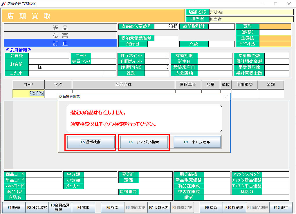 ※ タロスに存在しない商品コードを読むと、【商品検索確認】画面がポップアップ表示されます。