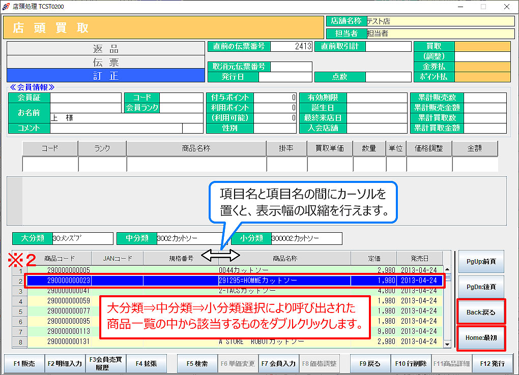 ※ 店頭買取画面は、会員管理の有無(店舗基本マスタメンテナンスで設定)、分類選択の可否(端末マスタメンテナンスで設定)により異なります。 下記画面は、会員管理をされている場合で分類選択が「可」に設定されている場合の画面です。
