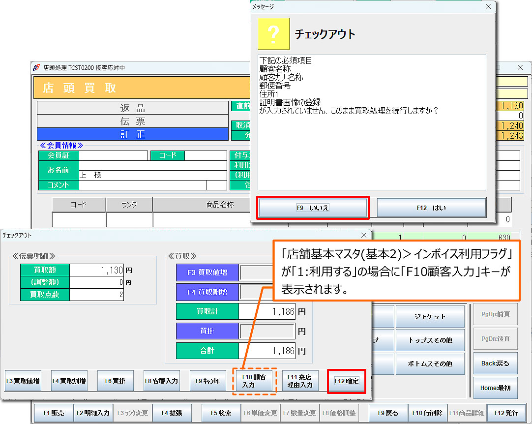 「F9いいえ」でチェックアウト画面に戻り、「F10顧客入力」より必須項目を入力してください。インボイス対応の買取伝票が発行されます。