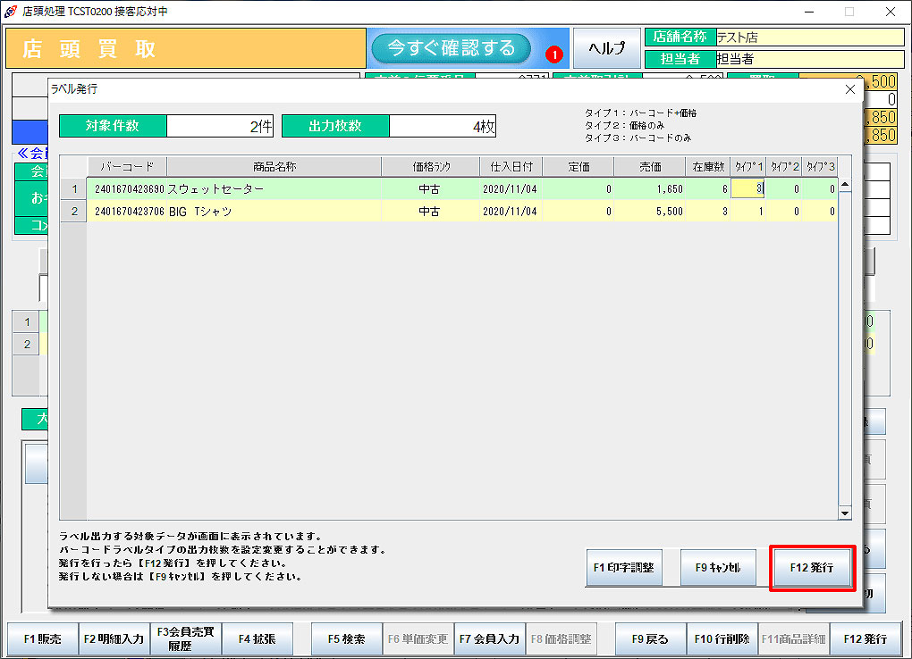 (分類別ランクマスタのラベル設定により)「ラベルを発行しますか?」と表示されます。 「F12はい」で【ラベルを発行】画面が表示されます。「F12発行」でラベルを発行します。