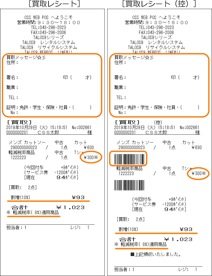 ※ 端末マスタ-店舗制御設定(買取)より「買取レシート署名欄」、「買取控え伝票バーコード印字」の有無が設定可能です。