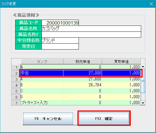 「F3ランク/金額変更(商品呼出し後)」:ランク/金額を変更します。